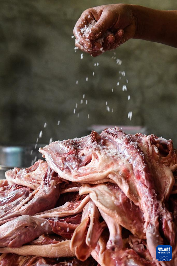 11月7日,在三江侗族自治县丹洲镇丹洲村,村民在制作腊鸭。