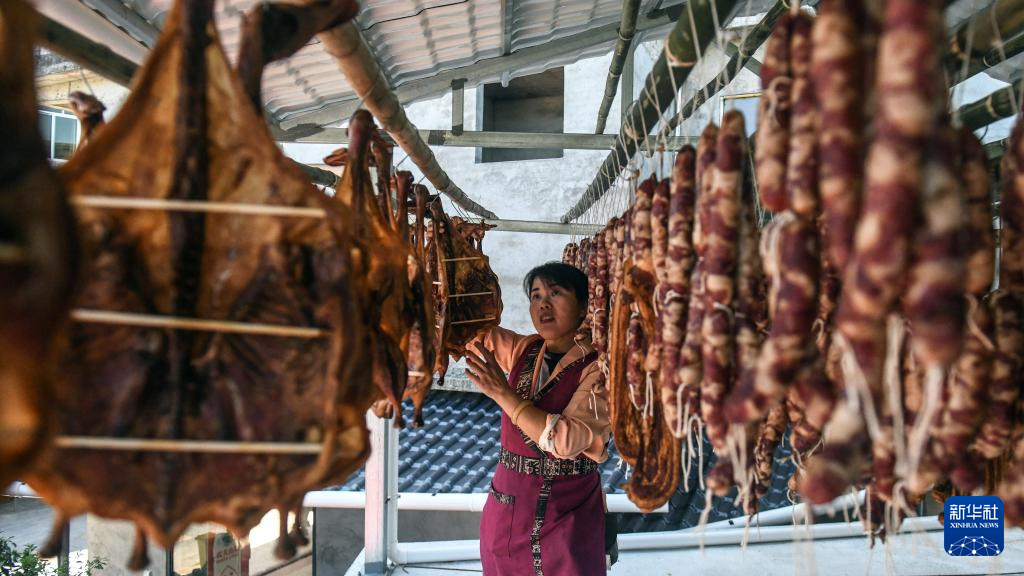 11月7日,在三江侗族自治县丹洲镇丹洲村,村民吴素梅在晾晒腊味。