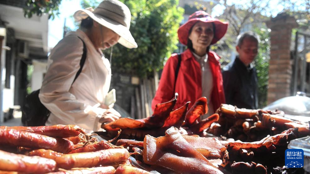 11月7日,在三江侗族自治县丹洲镇丹洲古城,游客在挑选腊味。