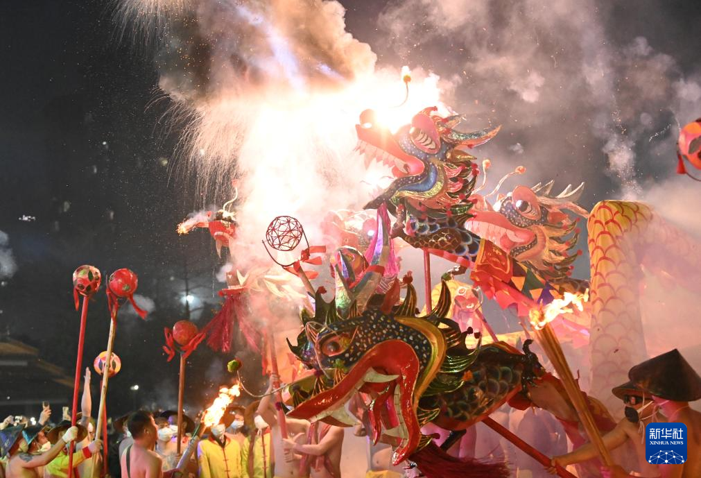 在广西宾阳县炮龙文化广场,炮龙腾舞间火光闪烁。新华社记者陆波岸 摄