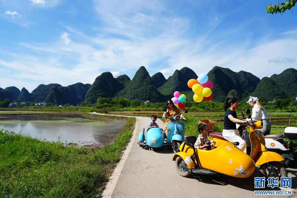 7月3日,在广西桂林市阳朔县,游客在骑摩托车游览。新华社记者 张枫 摄