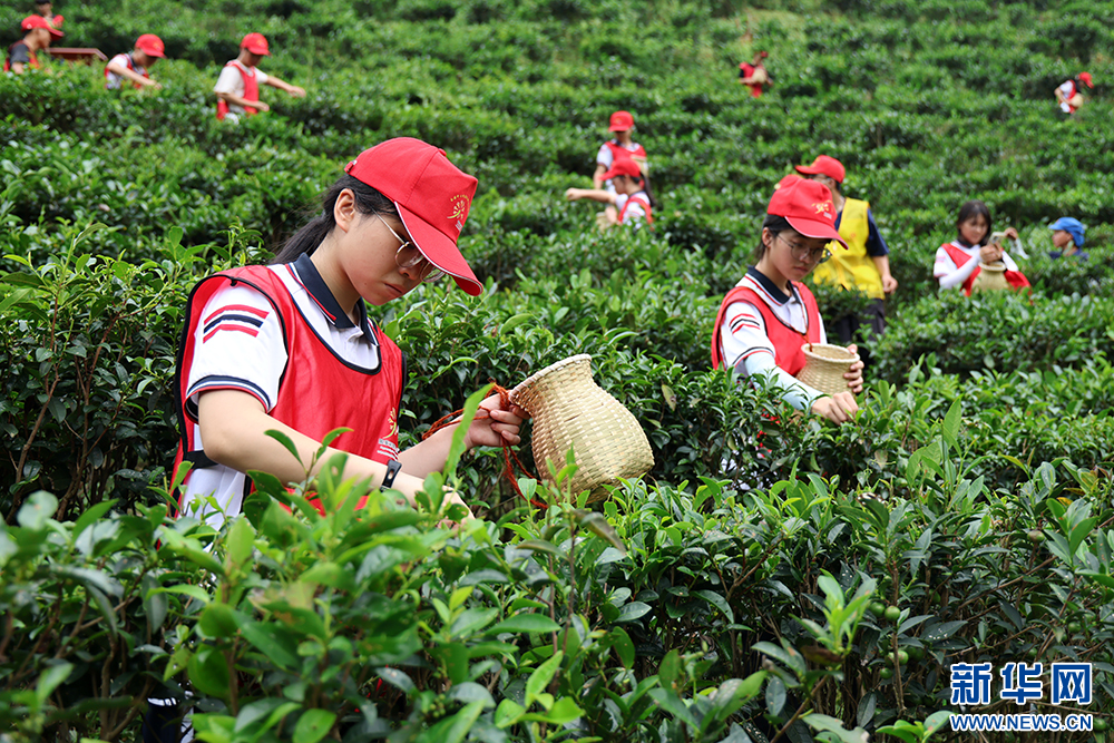 学生在梧州市苍梧县茶山体验采摘茶叶。邹雨成 摄