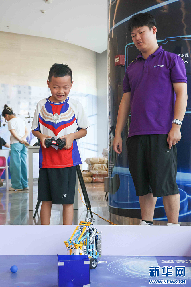 在南宁市良庆区青少年人工智能创意体现营活动现场,学生参加机器人“芯“灵手巧——机械工程对抗赛。陈子婧 摄
