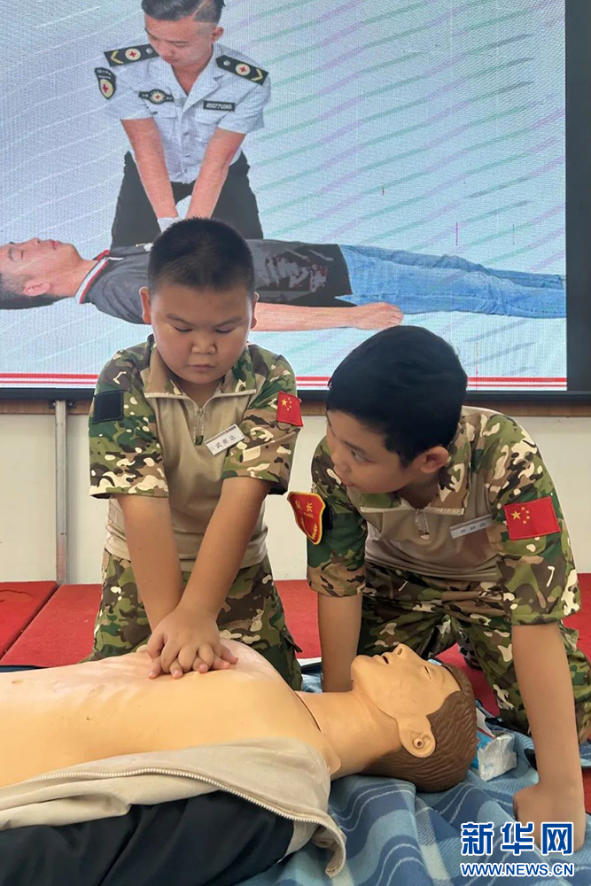 在南宁市良庆区大王滩营地夏令营,学生在学习心肺复苏急救法。