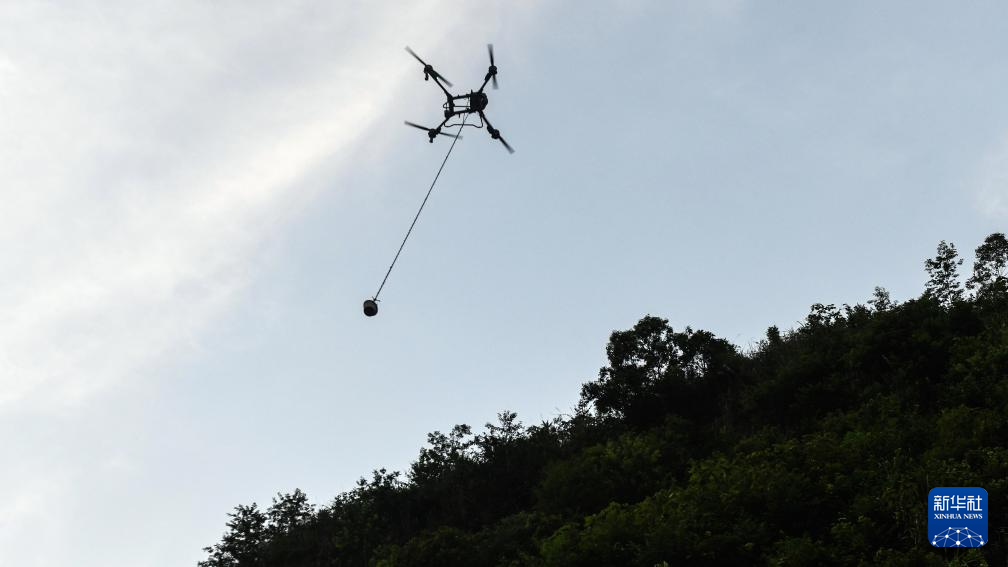 桥隧工人遥控无人机给隧道山体上的施工点运送混凝土(7月15日摄)。
