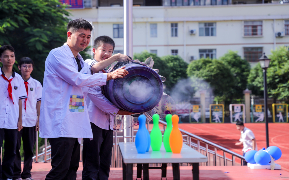 在科技展示与互动环节,北投信创公司展示了智能“机器狗”等前沿科技产品。广西康久生物科技有限公司带来液氮实验秀,通过超低温现象展示科学的神奇魅力。托特科学南宁中心则通过“火山喷发”“静电飞舞”等趣味实验,让同学们在动手实践中感受科学原理。