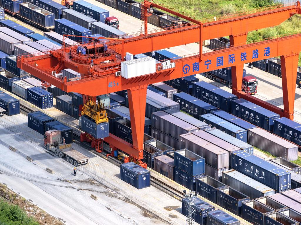 9月23日,工人在南宁国际铁路港装运货物(无人机照片)。