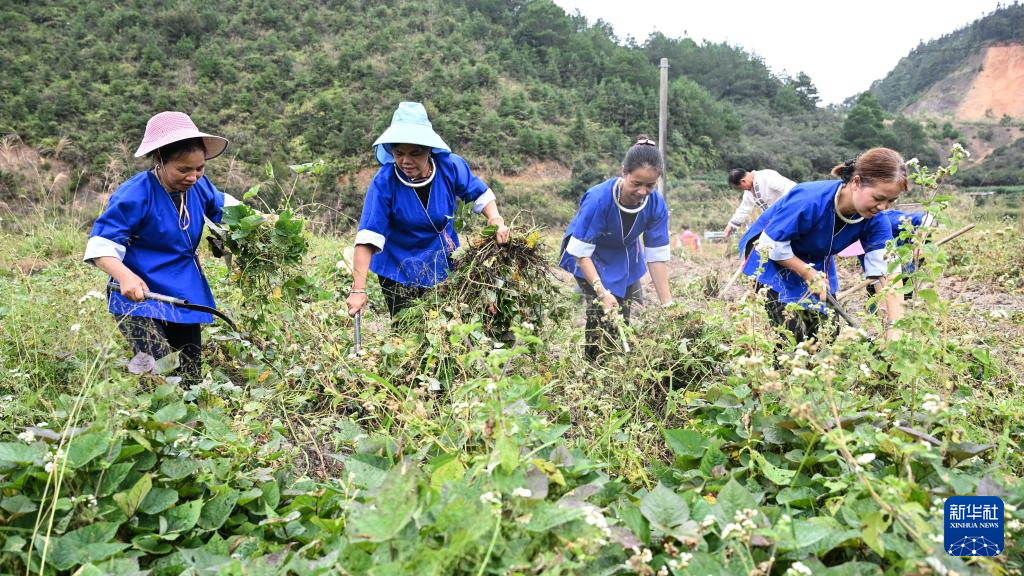 10月15日,广西三江侗族自治县林溪镇高秀村村民在割薯藤采收红薯。