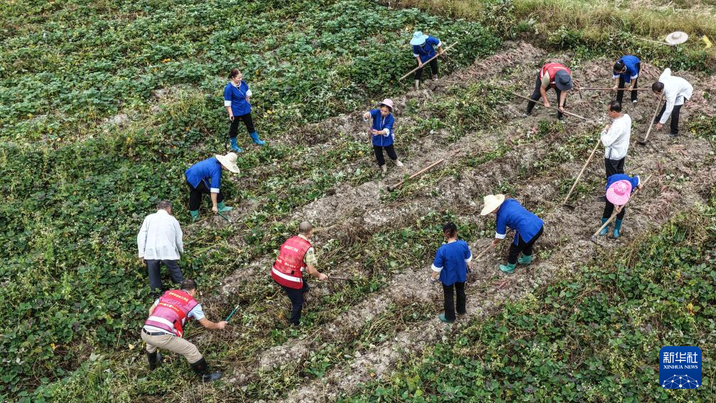 10月15日,广西三江侗族自治县林溪镇高秀村村民在田间收获红薯(无人机照片)。