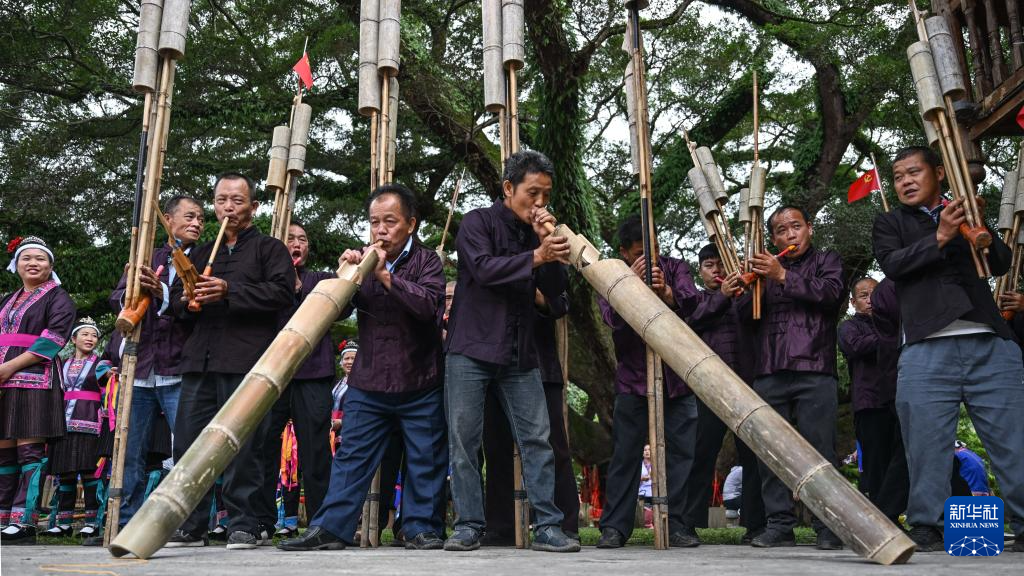 10月17日,在良口乡产口村活动现场,侗族群众吹奏芦笙迎宾客。