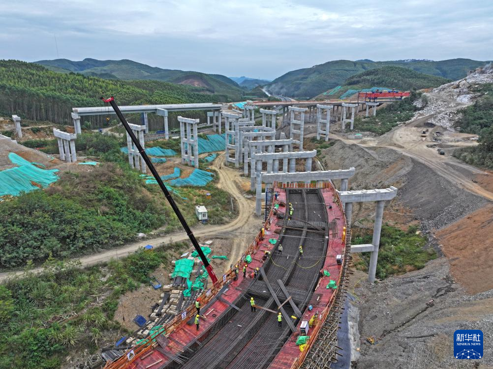 10月23日,中铁十一局的建设者在鱼宜高速公路里雍河大桥工地进行梁体架设施工(无人机照片)。
