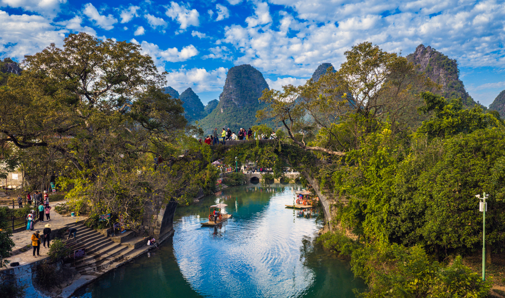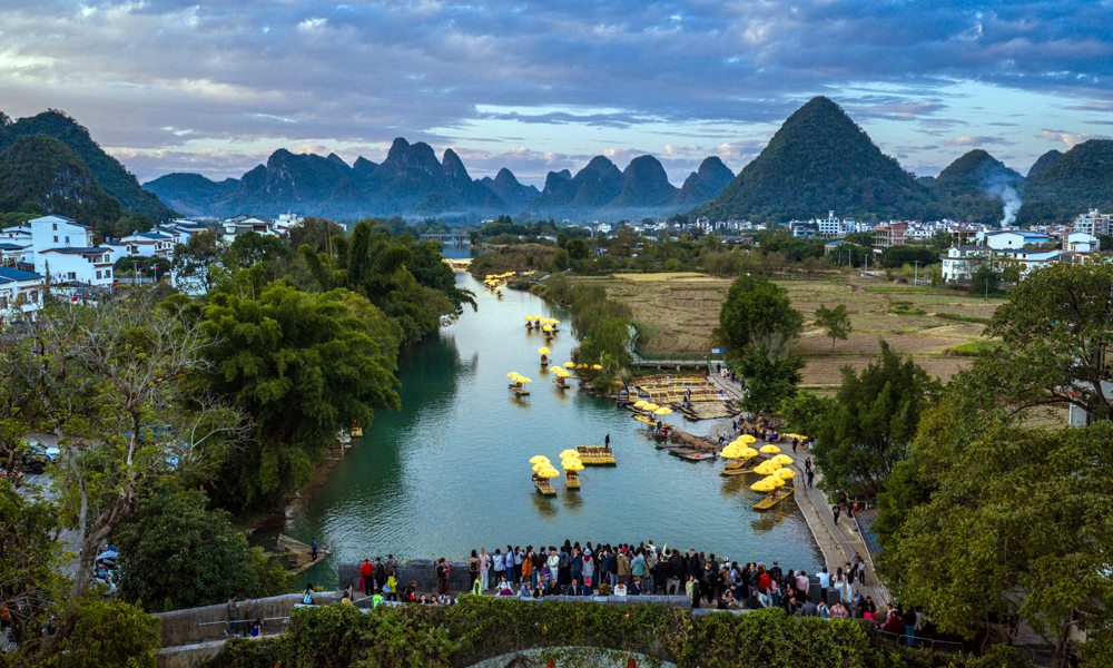 初冬时节,广西桂林市阳朔县遇龙河景区峰峦叠翠,碧水蜿蜒,如诗如画的景致吸引游客观赏游玩。