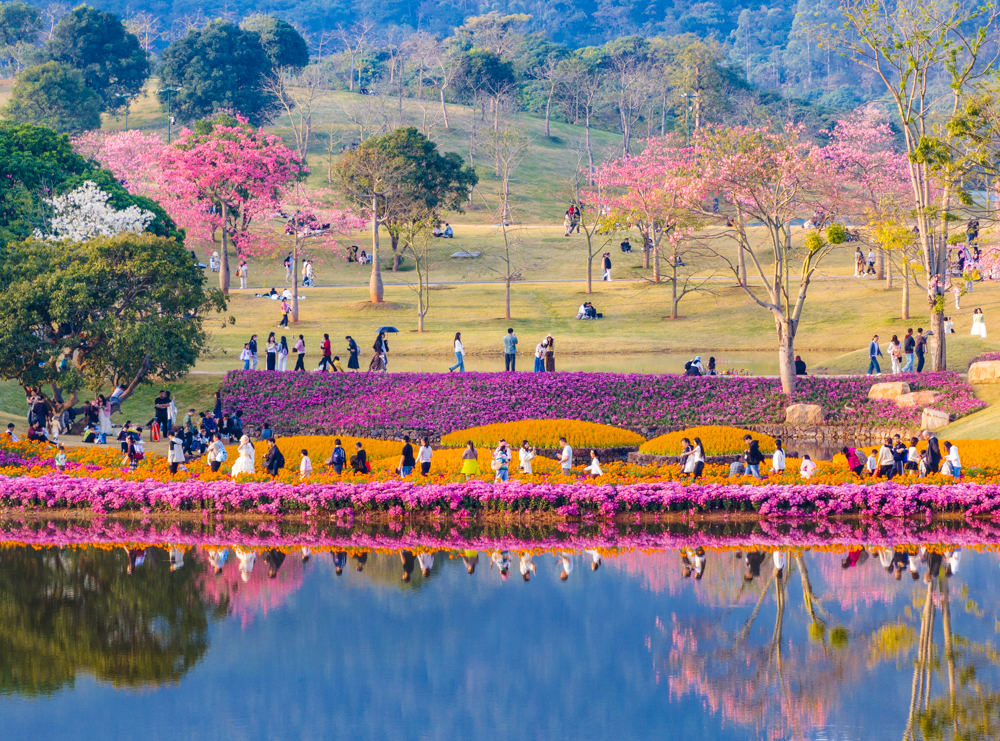 近期,广西南宁市青秀山风景区丘石花园的菊花进入盛花期,绚烂多彩的花海吸引众多游客前来赏花游玩。